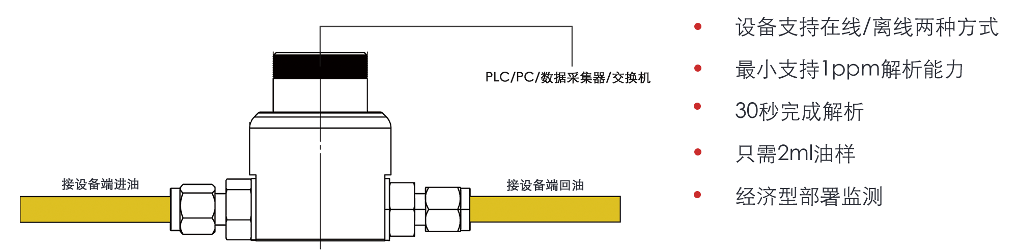 產品基于電磁感應的原理,裝置內部設計有靈敏的電磁線圈,當有磁性顆粒經過線圈時,油液中 的鐵磁顆粒會改變傳感器固定的磁場,根據數據變化加上智火柴的算法模型,可以將磁場變化與 磁性顆粒含量建立可直接讀取的關系,產品對于油液中夾雜的異常磨損顆粒有著極其敏感反應, 可對工業現場大型設備的設備磨損做出快速有效的判斷,適用于液壓油、齒輪油、潤滑脂等 工業油品。