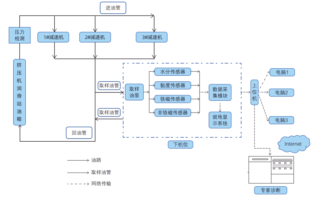 ▲擠壓機潤滑系統的油液在線監測系統原理
