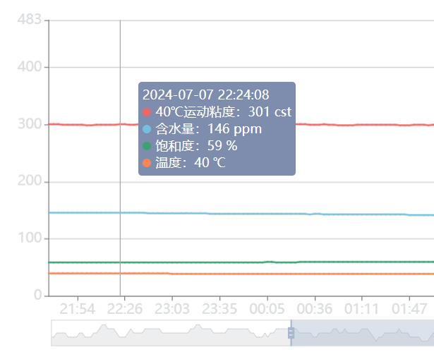 通過人機界面可以直觀查詢如40 ℃黏度、實時黏度、油溫、水分、鐵磁顆粒、非鐵磁顆粒等數據的歷史曲線。
